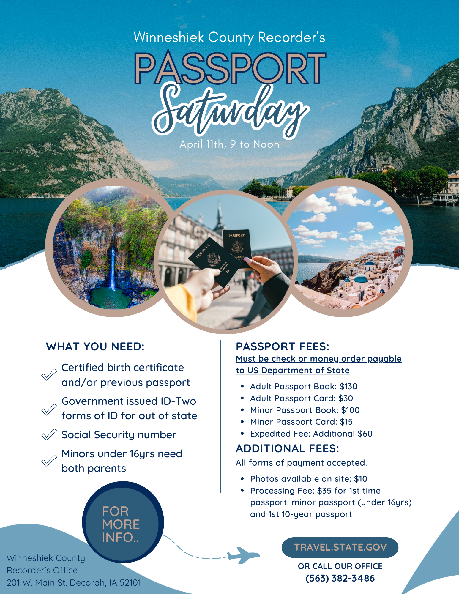 No appointment needed for Winneshiek County Passport Saturday! We’ll process new passports, assist with renewals, and provide passport photos on site. What to bring: • Certified birth certificate and/or previous passport • Government-issued photo ID (two forms if out-of-state) • Social Security number • For minors under 16: both parents must be present Passport Fees […]